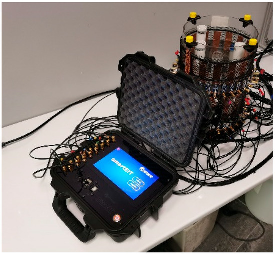 The SmartEIT (Figure 2) is an electrical impedance tomography measurement device. This device uses a set of graphite, point-sensing electrodes connected using SMB-electrode coaxial cables. The control and communication system is based on a Raspberry Pi 4 model B single-board minicomputer with a dedicated 7″ LCD touchscreen display with 800 × 480 resolution. The measurement board is equipped with a separate microcontroller from the STM32 family, based on a high-performance ARM® Cortex®-M4 32-bit core, operating at up to 72 MHz, equipped with 256 KB of flash memory, and 32 kB of RAM [14]. A key component of the data acquisition module is a set of built-in high-resolution analog-to-digital converters with software-controlled gain.
