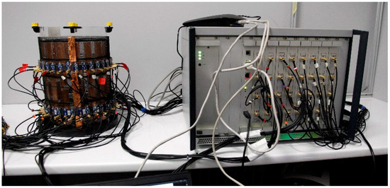 The ECT EVT4 (Figure 3) measurement device [54] is built on high-speed programmable circuits. The multi-mode channel system can use from 4 to 32 channels. Due to the many channels and high signal-to-noise ratio (SNR), it can be used for precise 3D measurements. Each channel has an analog-to-digital converter and multi-gigabit serial transmission for high data throughput, making dynamic imaging possible. In addition, the device utilizes a new capacitance measurement method with its novel single-shot high-voltage (SSHV) circuit.