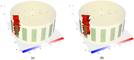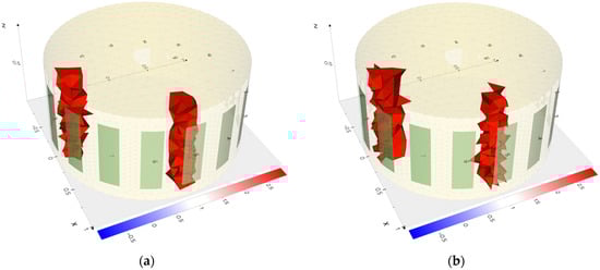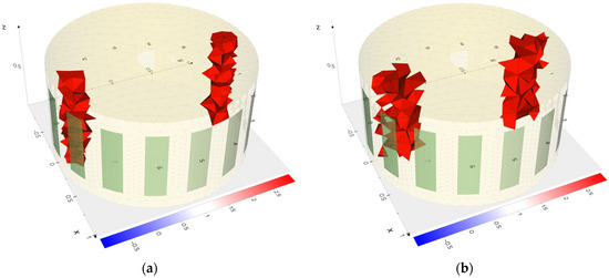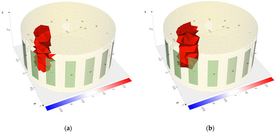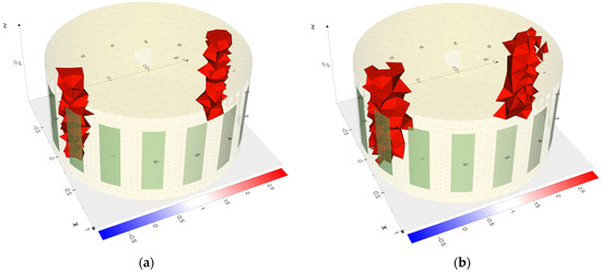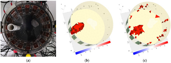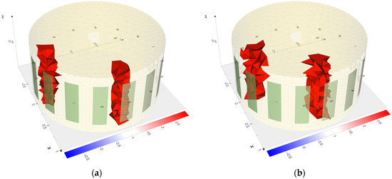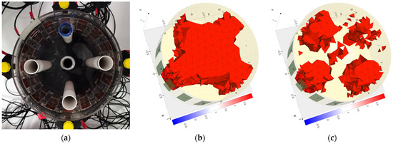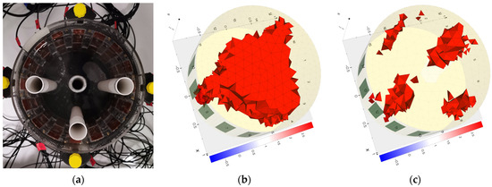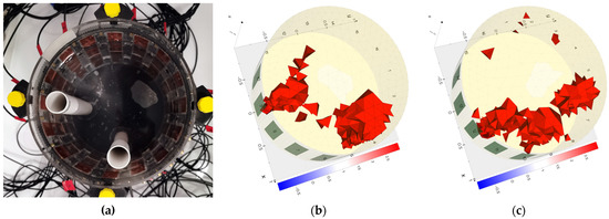 The results of the actual measurements confirm the conclusions obtained by comparing the reconstructions with the simulations. For example, in Figure 22a,b and Figure 23a,b, it can be observed that the centers of the reconstructed areas are blended for electrical impedance tomography. In contrast, for electrical capacitance tomography, the inclusions within the center of the reservoir are reconstructed as distinct inclusion. Thus, inclusions in that area are better reconstructed by the ECT method than by EIT.