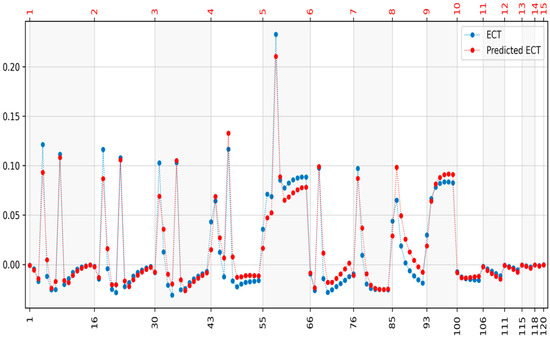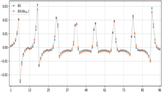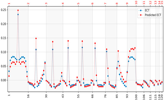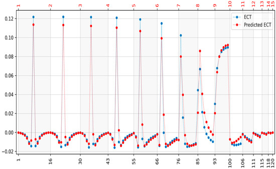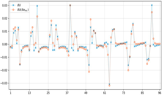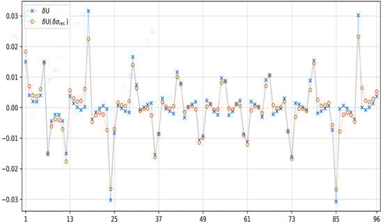 The first step was to train the elastic net model for both electrical tomography methods on 2000 randomly selected cases. Each of the 20,455 finite elements was trained separately. The parameters for which elastic net models were learned are θ = 10−4 and α = 0.3. Example reconstructions for one and three inclusions are shown for both methods. Example reconstructions for one and three inclusions are shown for both methods. Figure 5 shows the reconstruction for one inclusion and Figure 6 shows the impedance differences for EIT. Figure 7 shows the reconstruction for two inclusions and Figure 8 shows the impedance differences for the EIT measurements from Figure 7. Figure 9 shows the reconstruction for two inclusions but with a different inclusion position and Figure 10 shows the impedance differences for the EIT measurements from Figure 9. Figure 11 shows the reconstruction for one inclusion and Figure 12 shows the capacitance differences for ECT. Figure 13 shows the reconstruction for two inclusions, and Figure 14 shows the capacitance differences for the ECT measurements from Figure 13. Figure 15 shows the reconstruction for two inclusions but with a different inclusion position, and Figure 16 shows the capacitance differences for the ECT measurements from Figure 15. In addition, Figure 6, Figure 8, Figure 10, Figure 12, Figure 14, and Figure 16 show impedance differences for EIT, capacitance differences for ECT corresponding to the reference, and the measured values corresponding to the reconstructed case. Such a comparison allows one to see how far the measurements after reconstruction deviate from the reference. For comparison of distance values, the distances of the curves from Figure 6, Figure 8, Figure 10, Figure 12, Figure 14, and Figure 16 are shown in Table 1 and Table 2.