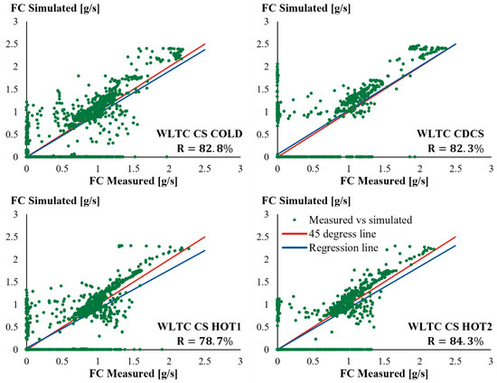 Table 5 compares the total simulated and measured FC and final SOC () values for the seven tests conducted. The absolute error in the simulation of total FC is lower than 7% for five of the seven tests. In the WLTC CD and WLTC CDCS tests, the FC estimation error is higher, but over very low FC values that overall lead to satisfactory deviations (WLTC CD: 0.5 g/km; WLTC CDCS: 4.2 g/km). The correlation coefficient between instantaneous measured and simulated fuel consumption () is always higher than 70% except in WLTC CD (57.7%). In WLTC CD, the initial SOC is rather high (71.4%) so the engine engagement is limited leading to few points where the instantaneous fuel consumption is non-zero, and this leads to a drop of the regression coefficient. With regard to battery SOC, the simulated final SOC values are quite close to the measured ones for WLTC. For the ERMES cases, the simulated SOC varies more than the measured one in WLTC. Additionally, for the ERMES CS the value is negative. This means that the simulated battery charging events do not follow the measured ones for that test. It is worth mentioning that the parameters tuning for engine start/shut-down events (Figure 1) were based on the WLTC tests experimental data. As the ERMES cycle has different characteristics, we expected that the model could not have the same accuracy as in the WLTC tests. For all the other test cases, the is higher than 69% which implies satisfactory model performance.
