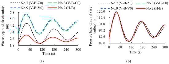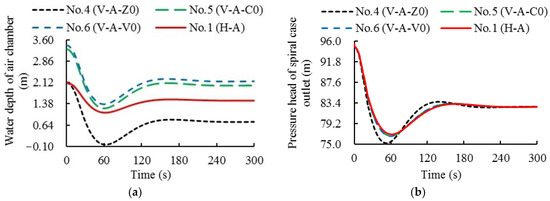 Secondly, with the same , the range of the first surge in the vertical ACSC was more extensive than that in the horizontal ACSC. The water depth rose to the maximum, occurring more quickly in the vertical ACSC, with smaller absolute air pressure. The maximum pressure at the end of the spiral case was more prominent in the vertical ACSC than in the horizontal ACSC.