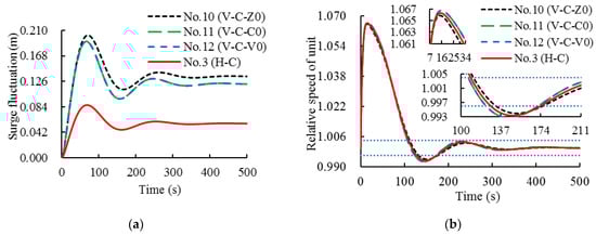 Firstly, when it was with the same , the range of surge in the vertical ACSC was more extensive than that in the horizontal ACSC. The maximum water depth occurred more slowly in the vertical ACSC. The regulating time that finally entered the frequency range of ±0.4% was 176 s in the vertical ACSC, more slowly than in the horizontal ACSC.