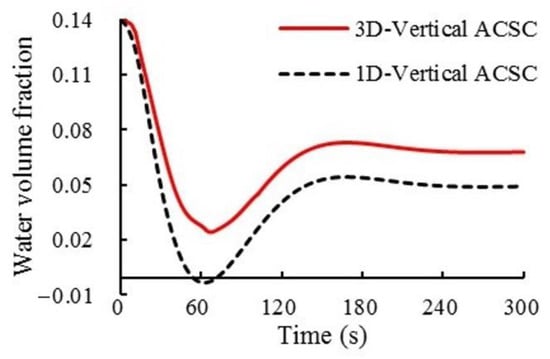 Before the 3D numerical simulation on local flow regimes in vertical and horizontal ACSCs, it is necessary to compare the results between 1D and 3D simulations. Take the vertical ACSC as an example. The difference in the water volume fraction in the vertical ACSC between 1D and 3D simulations is shown in Figure 6.