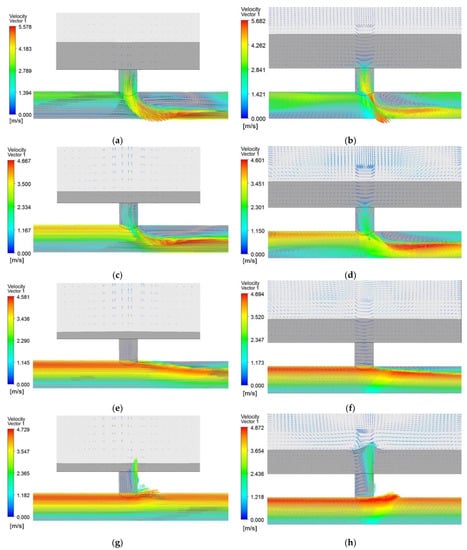 - The flow regime of the air–water surface of the horizontal ACSC was more complex than that of the vertical ACSC. It was difficult to form the air-trapped vertical vortices in the chamber for sufficient water depth. Only a surface vortex existed in the horizontal ACSC’s water.