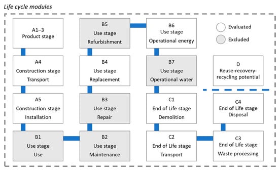The product system was defined following the “from cradle to grave” approach explained by the European Committee for Standardization with EN 15978 [] and EN 15804 +A2 []. The modules of the standards considered for the evaluation were: (i) A—product and construction stage, (ii) B—use stage (B4—replacement and B6—operational energy use), (iii) C—end of life stage, and (iv) D—reuse–recovery–recycling potential. Figure 1 shows the modules evaluated and excluded.