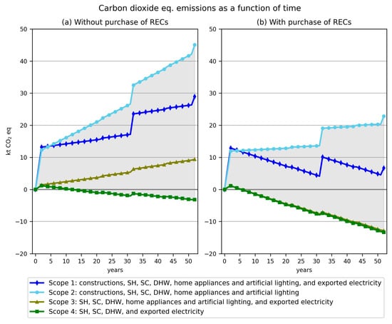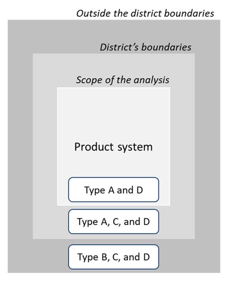 The authors would also like to stress that, at present, there are no standards and guidelines at the European level regulating this aspect when using the process-based LCA method, other than the Norwegian pilot project guideline “The Zero Emission Neighborhood definition” []. Previous work addresses [,,] the topic not with a life cycle approach but at the organization level in line with ISO 14064 [] (i.e., scope 1, 2, and 3).