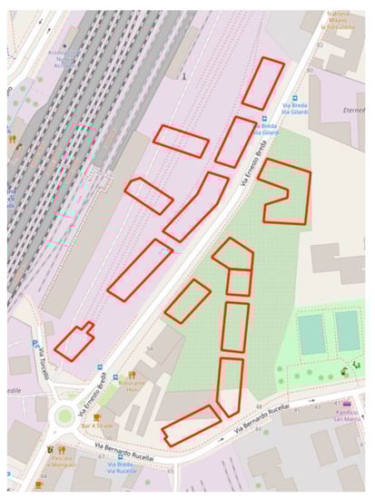 The case study is a district composed of 14 buildings, currently under construction, destined to become a social housing neighborhood in Milan, Italy. In this section, the authors explain the life cycle inventory (LCI) based on primary data used to implement the assessment, considering the scope described in the “Material and Methods” section. In particular, this section explains: (i) the construction technologies with the characteristics of the envelopes (i.e., type of construction materials, amount of construction materials, thermal transmittances, and end-of-life scenarios), (ii) the energy needs of the operational phase, (iii) the energy system installed (i.e., DHC network) to provide space heating (SH), domestic hot water (DHW), and space cooling (SC), and (iv) the photovoltaic solar array installed on the building roofs and the canopy used to supply the DHC network and to export the electricity to the national grid. Figure 3 provides a representation of the positions of the buildings in the district (red shapes).