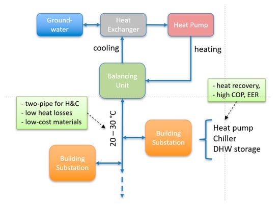 - Buffa, S.; Cozzini, M.; D’Antoni, M.; Baratieri, M.; Fedrizzi, R. 5th generation district heating and cooling systems: A review of existing cases in Europe. Renew. Sustain. Energy Rev. 2019, 104, 504–522. [Google Scholar] [CrossRef]