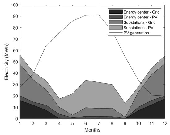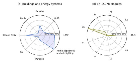 The benefits of exported energy produced by photovoltaic panels (PV) installed/mounted on the buildings (building-integrated generation) and located within the district site boundaries (generation within the district site) were included as additional information in Module D, as indicated by Satola et al. []. The benefits were assessed by multiplying the amount of energy exported by the difference between the climate profile of 1 kWhel from PV and the climate profile of the residual Italian electricity mix. The residual mix is a virtual mix representing the electricity consumption that is not explicitly tracked through mechanisms such as guarantees of origin (GO). The residual mix was calculated utilizing a report provided by the Association of Issuing Bodies (AIB) [] based on the dataset provided by the ecoinvent library, as explained in Section 3.4 of the article.