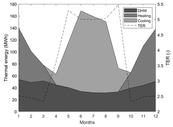 The thermal energy supplied to the heating, ventilation, and air conditioning (HVAC) distribution system depends not only on theoretical energy needs but also on the type of HVAC system used. For low energy consumption, which is a requirement typical of social housing, and improved indoor air quality, which is a compelling need in air-tight buildings, a suitable choice is fan coils for heating and cooling with mechanical ventilation. Mechanical ventilation with heat recovery is particularly suited to limit the heating energy demand, thanks to the high effectiveness achieved by new, high performing, air-to-air heat exchangers (75%). Fan coils are selected because they can be used for both heating and cooling, can perform dehumidification, and can operate in heating mode at relatively low temperatures (45 °C). The building thermal energy needs and the associated energy demands of the distribution system are reported in Table 3, along with heat demand for domestic hot water (calculated assuming 50 l/day/person).