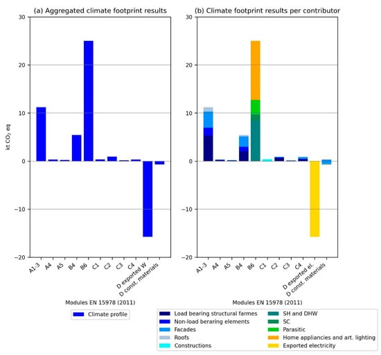 The climate profile of the district is expressed considering the GWP impact category, following the environmental footprint (EF) method 3.0 [] aligned with EN 15804 +A2, highlighting the contribution of the GWP total, fossil, biogenic, land use, and land use change.