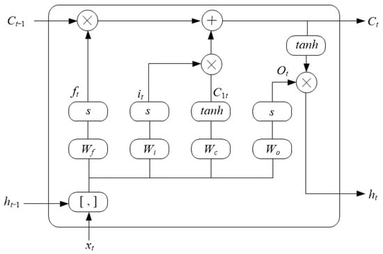 Where ht is the output vector at time t, and ct is the long-term state vector of the network at time t. Wf, Wi, Wc, and Wo are the input weight matrix of each state, ft, it, and ot represent the forget gate, input gate, and output gate in the network. c1t represents the current input state, s and tanh are the activation functions of the network, s is the sigmoid function, and tanh is the hyperbolic tangent function. The two functions introduce the nonlinear transformation into the neural network such that the network has robust nonlinear expressivity.