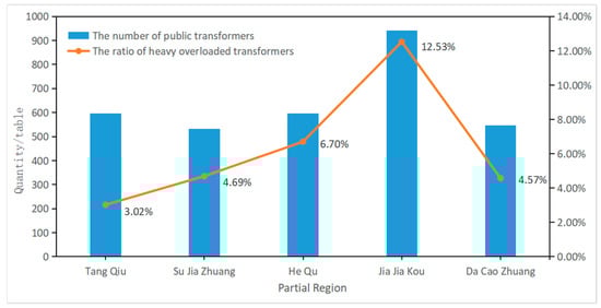 The power demand growth rates among regions are uneven, and the heavy overload proportions of the public transformers in different regions substantially vary due to the rapid development of the social economy and other factors. Hence, the regions are divided according to the level of the power supply stations. Statistics regarding the proportion of heavy overload of public transformers in five power supply stations during a certain period (Figure 2) reveal that the public transformers of the JiaJiaKou power supply station suffer from the most frequent heavy overload.