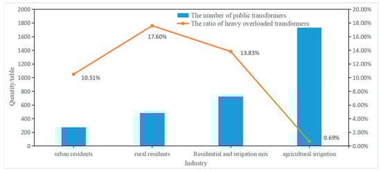 The seasonal features and period laws of the power load of public transformers vary depending on the industry’s features, which can be divided into urban residents, rural residents, mixed irrigation and drainage residents, and pure irrigation and drainage users. According to the statistics, the rural resident features present the most frequent heavy overload of public transformers (Figure 3).