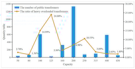 The public transformers’ loads present different states and change laws due to different capacity levels. Regarding the capacity levels, the public transformers can be divided into 20 kVA, 50 kVA, 100 kVA, and 250 kVA. According to the statistics regarding capacity levels, the 125 kVA-public transformers present the most frequent heavy overload of public transformers (Figure 4).