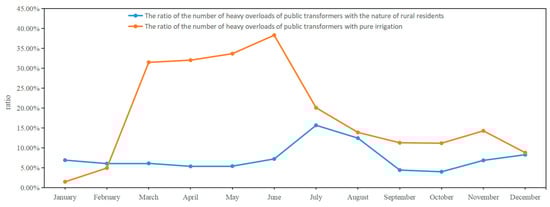 The load utilization of public transformers varies depending on the month. For example, during the pure irrigation and drainage period, public transformers suffer a heavy load. In contrast, the heavy overload of public transformers for urban and rural residents occurs more frequently during the air conditioning load period in summer and the electric heating period in winter (Figure 6).