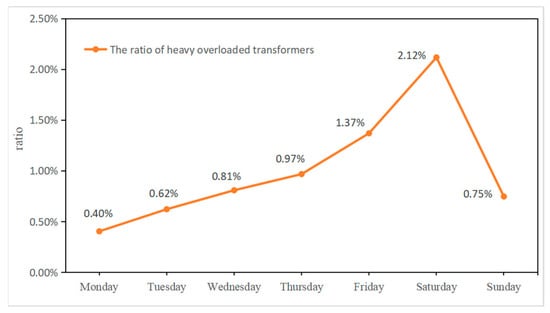 The load features of public transformers are closely related to the residents’ daily life rules. According to the statistics related to weekday features, the quantity proportion of heavy overload of public transformers in a certain region within one year (Figure 7) reveals that the heavy overload of public transformers occurs more frequently on Saturdays.