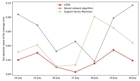 Taking the typical test period from 24 July to 30 July, the LSTM algorithm, neural network algorithm, and support vector machine regression algorithm are respectively applied to build the sub-high load rate model for 66,200 public transformers. The actual load rate of the transformers is used for verification, with the corresponding results illustrated in Figure 11, where the y-axis is the absolute value of the average error per model. The latter figure highlights that the LSTM method’s error in the test period is lower than that of the competitor methods.
