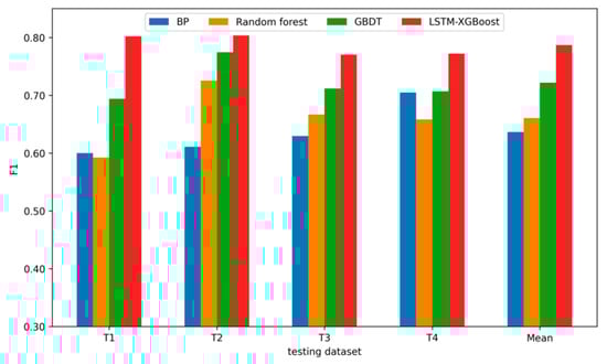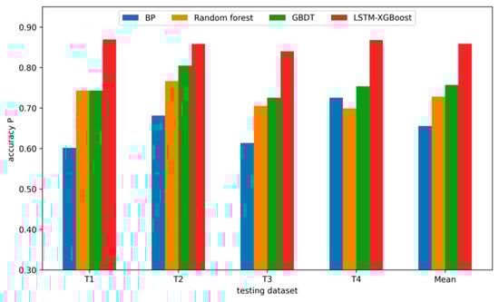 The performance of LSTM-XGBoost was compared against the BP neural network, random forest, and GBDT. For fairness, the parameters of each algorithm were optimized before the trials.