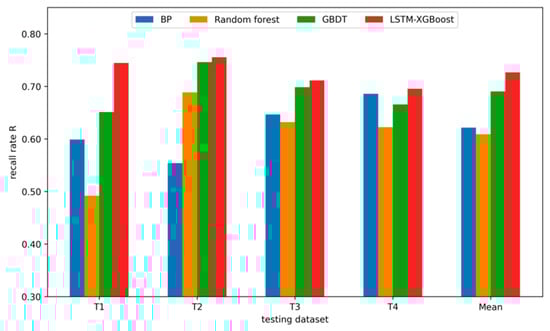 Recall rate R of heavy overload prediction models of public transformer based on each algorithm.