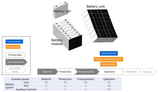 In the operation phase of a battery system, certain factors may considerably influence the total amount of CO2 emissions. These are classifiable into internal and external factors [13]. Internal factors include power conversion losses in the battery system and the weight of the battery itself [14]. The electricity losses due to diminishing batter efficiency are considered a significant factor in CO2 emissions in the operation phase [15]. Battery degradation is another major factor that can influence power conversion performance and result in increased CO2 emissions. The impact of the degradation-induced CO2 increase in the operation phase was analyzed based on an operation scenario considering the battery degradation condition [16,17]. However, a review of the literature suggests the impact of degradation is unclear because of a lack of information that could be used to compare efficiency between the initial state and the degraded state. In addition, the absence of a detailed calculation formula makes validity evaluation difficult.