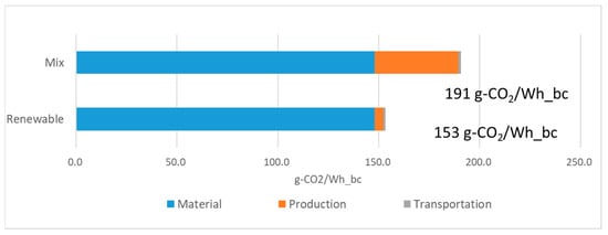 The CO2 emissions per battery unit storage capacity are illustrated in Figure 3. CO2 emissions per FU are 191 g-CO2/Wh_bc for mix and 153 g-CO2/Wh_bc for renewables. These results indicate that the carbon intensity of electricity production affects cradle-to-gate CO2 emissions.