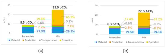 The total lifetime CO2 emissions are illustrated in Figure 4. CO2 emissions are 22.5 t-CO2 for mix, and 8.3 t-CO2 for renewables without degradation, and 25.0 t-CO2 for mix, and 8.5 t-CO2 for renewables with degradation. These results reveal that the dominant CO2 emission phases are the material phase for renewables and the operation phase for mix. The ratio of CO2 emission per total life cycle CO2 of the dominant phase are 65.9% for mix and 77.3% for renewables with degradation, and 62.2% for mix and 79.6% for renewables without degradation. These results indicate that determination of the dominant CO2 emission phase depends on the carbon intensity of electricity.