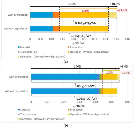 Regarding the CO2 emissions of individual phases over the total life cycle, the present study revealed that the carbon intensity of electricity affects the life phase that is dominant in terms of CO2 emissions. Additionally, these emissions are associated with power conversion losses considering the impact of degradation.