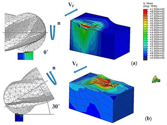 Numerical simulations were performed using the Abaqus/Explicit for machining operation and ANSYS software for harmonic response analysis. Two case studies were considered. The first case study considers the application of a conventional machining strategy (Figure 3a). The second one considers a strategy with an overlap of inter-line scallops at a 30° angle to the surface (Figure 3b).