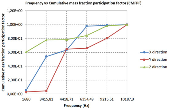 Figure 5 shows that the smallest cumulative mass fraction in the excitation of vibrations at obtained eigenfrequencies is required in the Y direction. This fact corresponds to the direction of the minimum stiffness of the turbine blade. It also confirms the reliability of the chosen simplified design scheme presented in Figure 1.