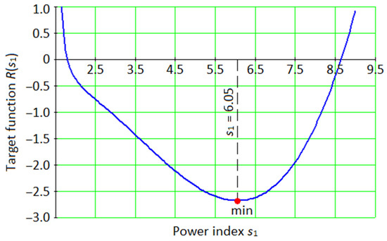 According to the variational approach, the power index, sk, of Formula (7) for k = 1 should be evaluated by minimizing the target function (8). The corresponding result is presented in Figure 6.