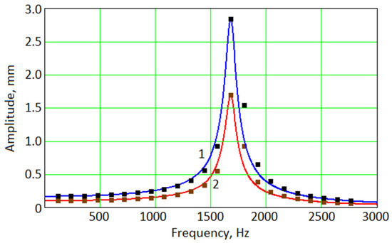 The amplitude–frequency response. 1, 2—numbers of machining modes; dots—experimental results data; lines—theoretical curves.
