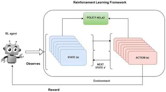 Machine learning supports various applications, such as data prediction, classification, regression analysis, and clustering. In supervised learning (SL) [1], input and output data (labeled data) are fed into the system that generates a model. Unsupervised learning (UL) [2] finds associations, similarities, and variations in unlabeled data and extracts hidden information. SL, UL, and RL [3] are three types of machine learning. The generated model can predict the output for new unknown data. Spam detection [4], image and object detection [5], predictive analytics [6], text classification, and other applications make use of SL. SL algorithms include logistic regression, linear regression, decision tree, random forest, and support vector machine (SVM) [7]. Clustering with the k-means clustering algorithm and dimension reduction with principal component analysis (PCA) are two UL applications. Deep learning has been able to overcome the shortcomings of machine learning. Machine learning extracts features separately, whereas deep learning extracts features automatically and without human intervention. Machine learning cannot handle large amounts of data, but deep learning can take millions of data points. Deep learning can process unstructured data such as images and audio. Because of their dynamic nature, specific real-time scenarios, such as recommendation systems and self-driving cars, do not have sufficient datasets for training. Reinforcement learning is introduced to address this issue. The third type of machine learning is RL [8]. RL is appropriate for sequential decision-making processes and learns through direct interaction with the environment to achieve long-term goals without external motivation or complete knowledge of the environment. Figure 1 depicts the RL framework.