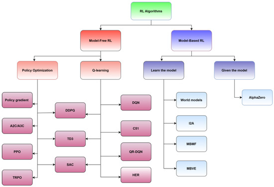 An RL process that satisfies the Markov property (MP) is called a Markov decision process (MDP) [14]. Different RL algorithms are available in the literature, and the hierarchy of algorithms is given in Figure 2.