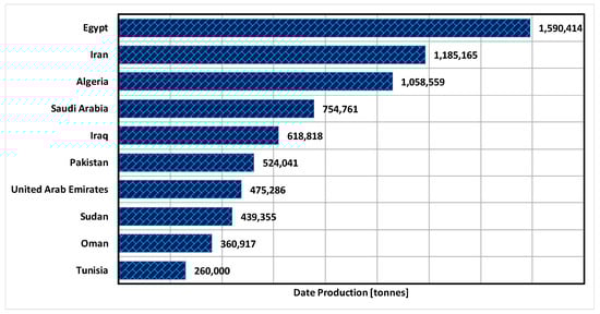 The date is the pitted fruit of the desert palm tree. Date seeds represent an average 15% of the date fruit’s mass [] and contain 10% oil on average []. Global date fruit production has increased from 1.85 million t in 1961 to 8.16 million t in 2017, with ten countries represented almost 89% of the total world production in 2017, all in the Middle East or Africa (Figure 1) []. A rough estimation based on these numbers suggests that 1.22 million t of date seed are produced annually, which could supply 122,490 t of DSO. Theoretically, 122,490 t of biodiesel could thus be extracted annually from this resource, a significant amount when compared with the 38,700 t produced throughout the Middle East and Africa in 2015 [].