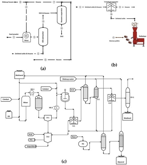 Flow chart of relevant processes for DSO biodiesel production plant: (a) oil extraction, (b) biomass pellet production, and (c) biodiesel production [].