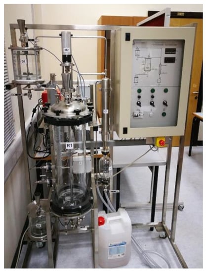 Our biodiesel production test used powder obtained from a local date producer. DSO was extracted using the Soxhlet extraction system (B-811-BUCHI) and subjected to hydration and centrifugation processes to eliminate the gums generated from the oil []. Next, the DSO underwent a treatment (by phosphoric acid) to bring the elevated extents of Mg, Ca, and P down to levels set by the standard (ASTM D6751). The DSO was then converted to biodiesel by the transesterification reaction in the pilot biodiesel production plant (UPB/EV-Elettronica Veneta) (Figure 3). The resulting biodiesel was then purified, its properties characterized, and its conformance with the ASTM D6751 standard confirmed.