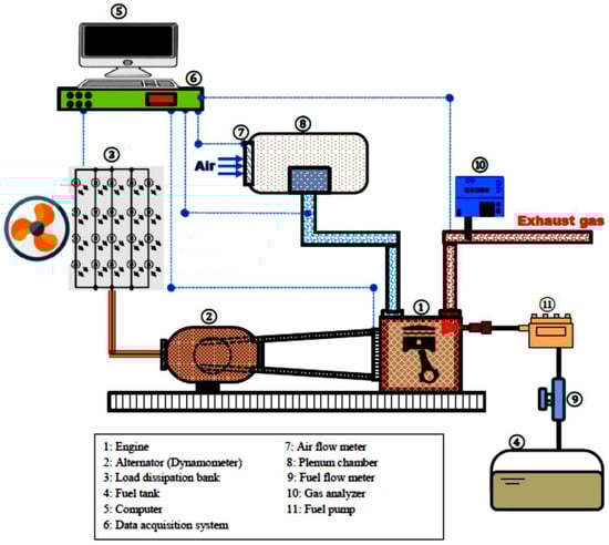 The performance tests used a single cylinder, four stroke, air cooled compression ignition engine originally designed for petrol diesel (Table 2, Figure 4). This was a naturally aspirated engine that did not include a turbocharger, supercharger, or exhaust gas recirculation system. The fuel injection system was driven by a diaphragm pump housed in the crankcase and operated by a camshaft via tappets. The fuel injectors were located close to the center of the combustion chamber with the nozzle ends projecting 0.25 cm from the cylinder head. The engine had a hemispherical bowl-in-piston combustion chamber design. Air was inducted to the engine via a plenum chamber with an orifice plate at the inlet; this had a differential pressure transducer to measure engine inlet air flow. This configuration was necessary for measuring air flow rate because of the pulsating air flow pattern caused by the reciprocating nature of the piston movement; the plenum chamber damped such pulsations. Engine fuel consumption rate was measured by a burette connected to the fuel line between the engine and fuel tank. The fuel injection timing was maintained unchanged and according to the original manufacturer’s settings.