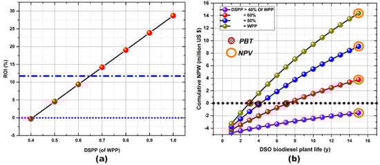 Economic performance analysis of the 1000 t/y DSO biodiesel plant by: (a) ROI vs. DSPP as % WPP (blue lines mark 0 and the acceptable 12% level) and (b) PBT and NPV by plant lifetime for four DSPP values.