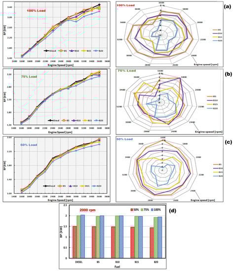 The biodiesel blends had lower BP values than baseline diesel for the entire speed range under all three engine loads; this became more pronounced with progressively higher biodiesel fractions (Figure 6). The most significant differences were evident at lower engine loads and higher speeds. The highest drop in BP (4.7%) for B5 occurred at 3000 rpm, compared with 9.2% for B20 at 3600 rpm (both under full load). The baseline diesel fuel was superior throughout, and none of the blends could produce peaks as high as the baseline. These results match those in previous research [,,].