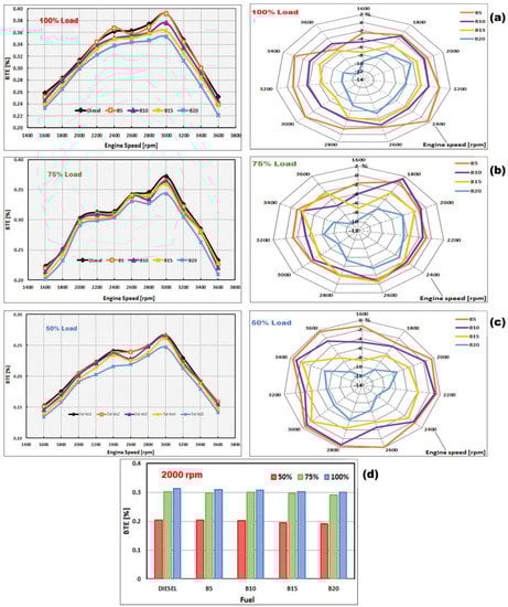 BTE is of great interest because it assesses the engine’s capability to convert chemically stored fuel energy into useful shaft work. The baseline diesel outperformed the biodiesel blends under all three loads and the full speed range (Figure 7). The baseline diesel achieved a maximum BTE of 39% at 3000 rpm under full load, while B20 was 9.5% lower under the same conditions. Higher biodiesel fractions consistently produced lower BTE and B20 had the worst performance throughout; this is in agreement with some existing literature [,,]. Other studies showed no variations in power and efficiency with biodiesel fractions up to 30% [], negligible differences [], or even the opposite trend of enhancement in fuel conversion efficiency with increased biodiesel fraction [,,].