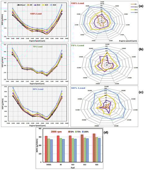 The baseline diesel showed excellent performance with regard to BSFC, with lower consumption (desirable) at all speeds under all loads (Figure 8), in agreement with almost all relevant findings reported in the literature. Increasing the DSO biodiesel fraction in the blends tended to increase the BSFC as compensation for the reduced energy content of the biodiesel, as shown by most research. Many studies, such as [,], have reported that the percentage increase in biodiesel blend consumption matches the percentage decrease in energy content. However, in this study, the increase in BSFC did not match the reduction in fuel energy content, in agreement with [,].