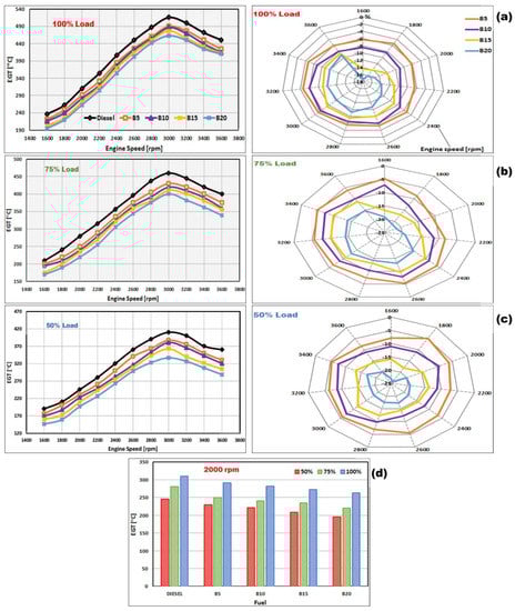 For all considered speeds and loads, higher fractions of DSO biodiesel produced lower EGTs (Figure 9). This trend is related to the lower heating value of the DSO biodiesel, which lowers the temperature in the combustion chamber and exhaust port. For example, a reduction of 74 °C was observed in EGT for B20 at 3200 rpm and 50% load. Significant variations occurred at 2800–3200 rpm: 32 °C at 75% load, 45 °C at 50% load, and 60 °C at 50% load for B5, B10, and B15, respectively. Similar trends and interpretations were also reported by [], while a drop of 59 °C was observed with a B20 microalgae biodiesel blend [].