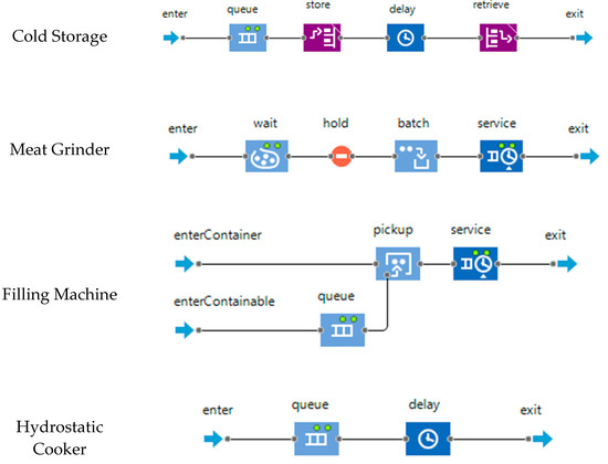 The meat-product agent will be inserted into the process block through the enter block. After entering the block, the product will go through the process steps in the specific agent before exiting the next step in production or finishing the production. All the process blocks were modeled based on the above concept. The cold storage had to be slightly altered to include a rack system for storage. For raw-material storage, the products are transferred to a storage rack, where they will stay for a specified time before being picked automatically and continuing production. The rack-store delay may be case-specific, as the meat is retrieved based on its usage in a required recipe. The current implementation delays all the products for the same duration of time. The meat grinder will wait for a specified amount of meat agent to enter the process; once the amount is satisfied, the products are batched into one new meat agent which is delayed, based on the grinder setting. The filling machine will take two inputs of a container, i.e., a can and a containable entity, i.e., meat, and will add the meat to the can, which can be delayed for a set period. The hydrostatic cooker will take the filled-can agents and delay them for a period corresponding to the cooking time.