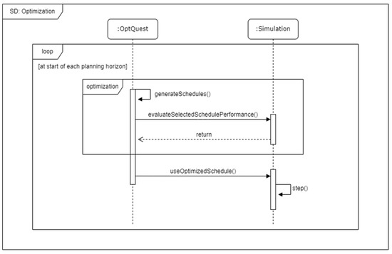 As seen from the sequence diagram presented in Figure 6, the optimization is started by generating all possible operation schedules. Using the developed simulation, the operational schedule performance is tested under the outlined constraints. Once an optimized schedule has been identified, it is used to for simulating the forthcoming 24 h in the simulation before the optimization procedure is repeated. As the simulation-optimization engine does not support schedule optimization, an alternative approach is used for selecting the appropriate schedule. A discrete schedule contains a finite number of possible combinations and a finite number of possible states. Therefore, the possible schedules can be constructed as arrays of states from the current timestamp, n, until the desired planning horizon, m, i.e., the number of future timesteps considered.