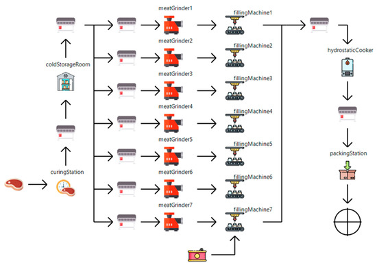 The developed simulation represents the chosen canned-meat production, which can be used for examining the potential for energy flexibility. Canned-meat production consists of several facility-specific process steps. While in production, the meat is contained in various cold-storage areas collectively controlled by one or multiple refrigeration units. Facility resources can be required for operating the processes, e.g., personnel for operating machinery or forklifts for transporting goods.