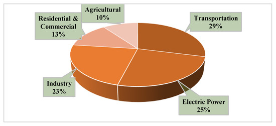 Environmental sustainability is one of the key expanding the interests of current time [1,2,3]. Industrial trash, business and residential infrastructures, power generation techniques, and agriculture harm our ecology [4]. Transportation is responsible for 25 percent of global greenhouse gas emissions [5,6]. Global CO2 emissions will exceed 37 gigatons by 2035, says the IEA. Multiple economic sectors including transportation, industry, power generation, production of heat, and agriculture to generate CO2 emissions. According to Figure 1, the production sector, which includes the production of heat and energy, is responsible for 41.2% of all CO2 emissions.