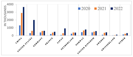Electric vehicle volumes (thousands) on the road in 2020–2022.