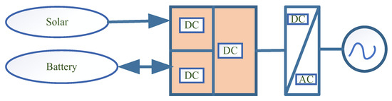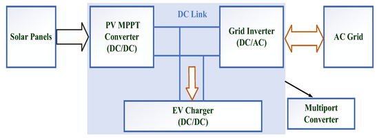 Power converters are essential for achieving flexible active power regulation between PV, HESS, and the AC grid integrated PV system. Typically, the arrangement of HESS integrated PV systems are categorized into two types: AC and DC type. Every PV system uses DC-DC and grid-tied DC-AC converters in the most popular DC-coupled integration technique to connect the battery to the system’s common AC bus [14,15]. This system provides independent flexible power control due to the excessive number of power converters that are required, but it is inefficient and expensive. The suggested multi-port converter can reduce the aforementioned restrictions. Since Solar and batteries share the DC-DC stage and PV and smart grid share the DC-AC stage [16,17,18,19,20], multiport converters have gained popularity. Figure 4 show two DC-coupled integration methods. As illustrated in Figure 5, multi-port DC-DC converters are suitable choices for the DC-DC stage because they interconnect simultaneously with the PV, HESS, and DC bus. A DC 600 V microgrid was created in [21] and is coupled to the driving VFCs (Voltage Frequency Converters) intermediate circuits utilized in induction motor drives. The reactive current component does not flow through the inverter’s freewheeling diodes when it charges the EV battery. A new solution includes employing a driving frequency converter as an EV battery charging converter.